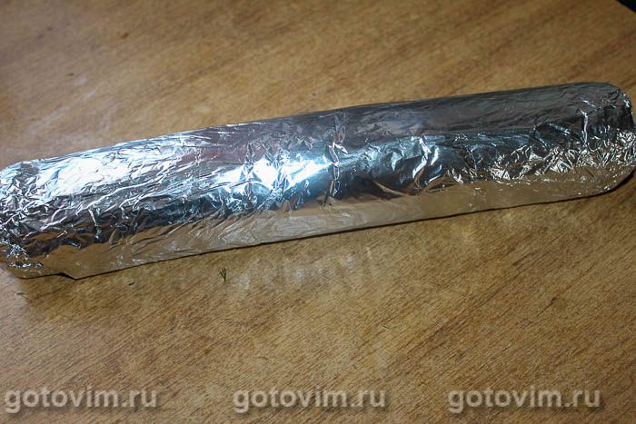 и скатать рулетом. Обернуть рулет фольгой и убрать в холодильник на 30 минут.