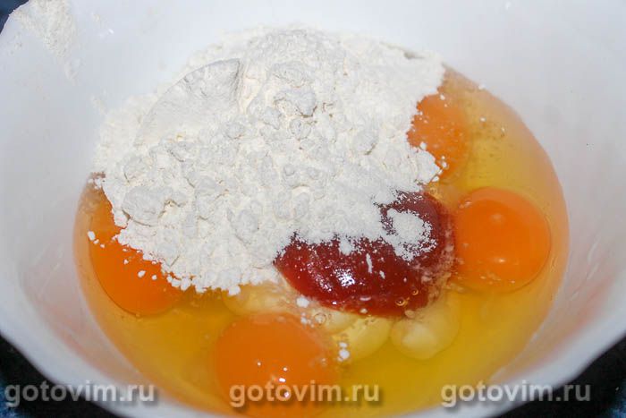 В глубокой миске смешать яйца, майонез, кетчуп, муку и воду. Посолить, поперчить и взбить до однородности венчиком (или миксером).