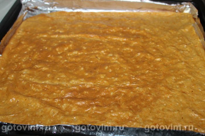 Вылить яичную смесь на противень, застеленный фольгой и смазанный растительным маслом. Выпекать в предварительно разогретой до 180С духовке 10-15 минут.