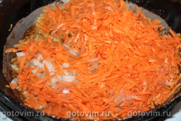 Далее начистить и натереть на крупной терке морковь. Порезать лук перьями. Обжарить их до готовности на растительном масле.