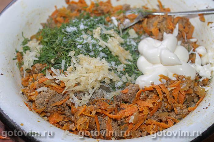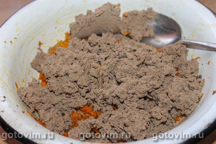 Затем переложить получившуюся овощную пассеровку в миску, прибавить измельченную блендером печень и перемешать.