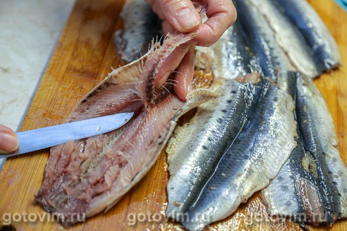 Тонким ножом сделать надрез вокруг головы рыбы и потянуть на себя со стороны брюшка. Позвоночник легко отделится от филе вместе со всеми косточками. То же самое проделать с остальной рыбой.