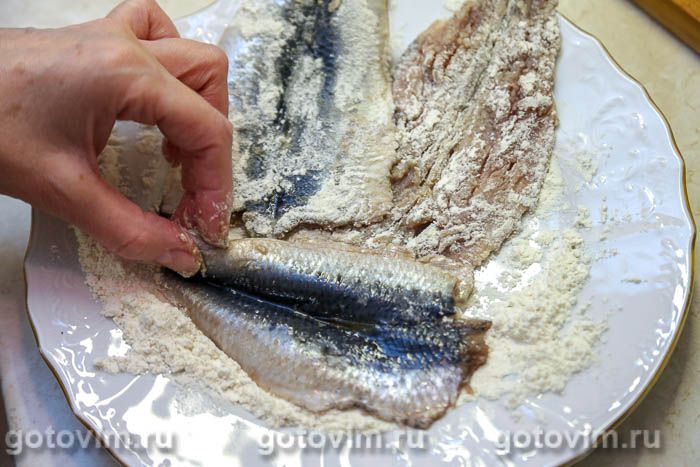 На плоскую тарелку насыпать 2 ст.л. муки, добавить немного соли и молотого перца. Каждое филе иваси обвалять в муке.