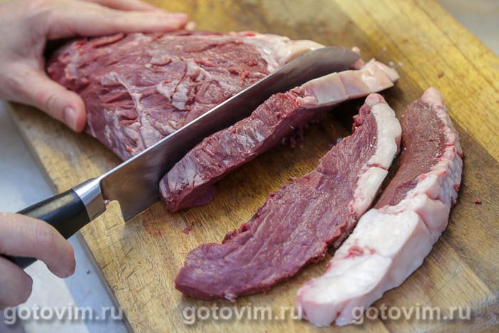 Положить половинку говяжьего сердца на разделочную доску срезом вниз, и нарежьте поперек волокон ломтиками толщиной примерно 2 см. В идеале у каждого ломтика должна быть небольшая часть жира.