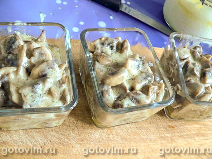 Разложите грибы со сковороды по порционным емкостям. Сверху добавьте по одной столовой ложке оставшегося соуса. Разровняйте соус по поверхности. Украсьте, выложив поверх соуса решетку из сыра и обжаренные ломтики шампиньонов. Старайтесь, чтобы до верхней кромки формочек у вас оставался запас примерно в 1 см. Иначе при кипении соус может убежать «через край».