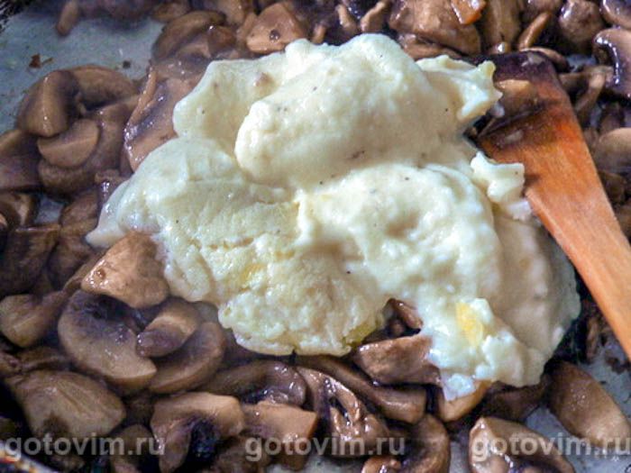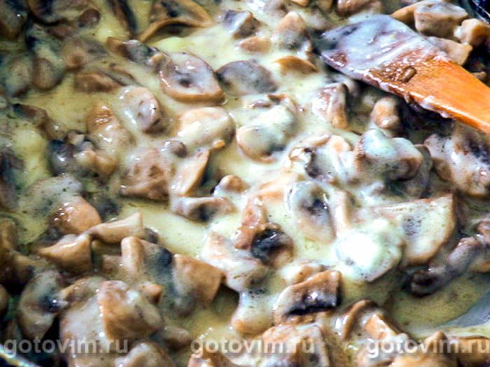 Снимите сковороду с плиты и добавьте в грибы половину готового соуса бешамель.