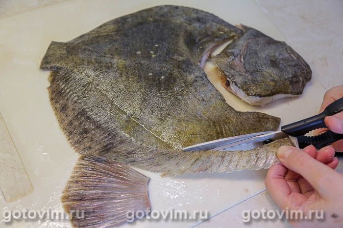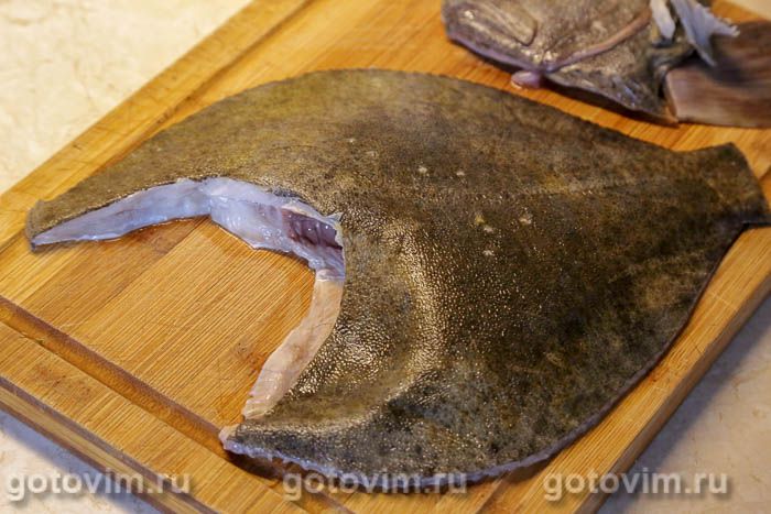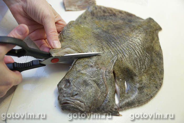 и отрезать голову. Промокнуть рыбину снаружи и внутри бумажным полотенцем. Обязательно удалить черную пленку и кровь вдоль позвоночника камбалы.