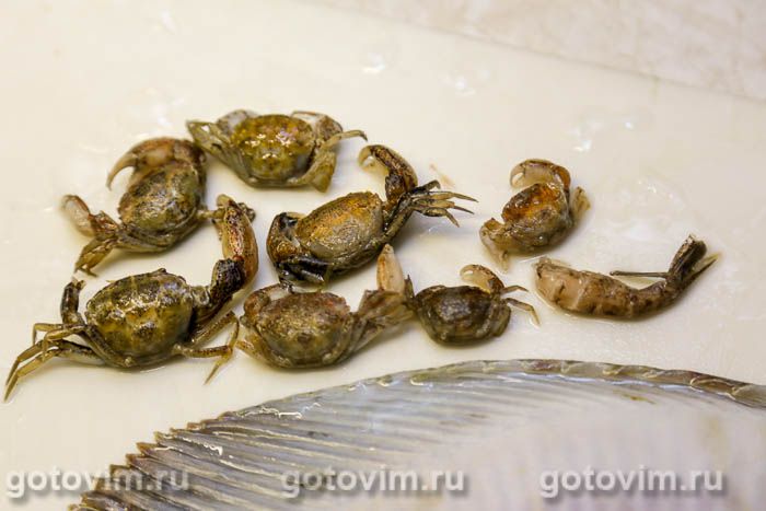 Не удержалась, и изучила содержимое желудка камбалы. Похоже, перед тем, как рыбу поймали, она хорошо пообедала крабами и креветкой.