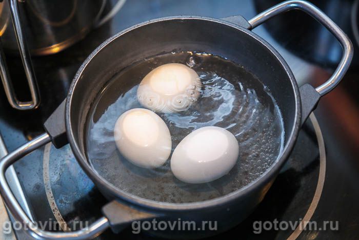 Куриные яйца вымыть, положить в холодную воду и варить 10 минут после закипания воды (или 11 минут, если яйца только что достали из холодильника). Сваренные вкрутую яйца переложить из кипятка на тарелку.