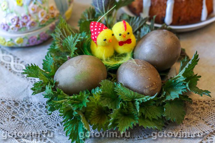 Положить и в эту кашицу вареные яйца и оставить минимум на 1 час. Чем дольше яйца лежат в крапивном отваре, тем темнее они получаются. В результате яйца будут от светло-зеленого до темно-коричневого. Цвет скорлупы, конечно, тоже имеет значение. Крашеные яйца вынуть из кашицы, положить на тарелку, чтобы скорлупа высохла, а затем с помощью ватного диска смазать для блеска растительным маслом. Готово!