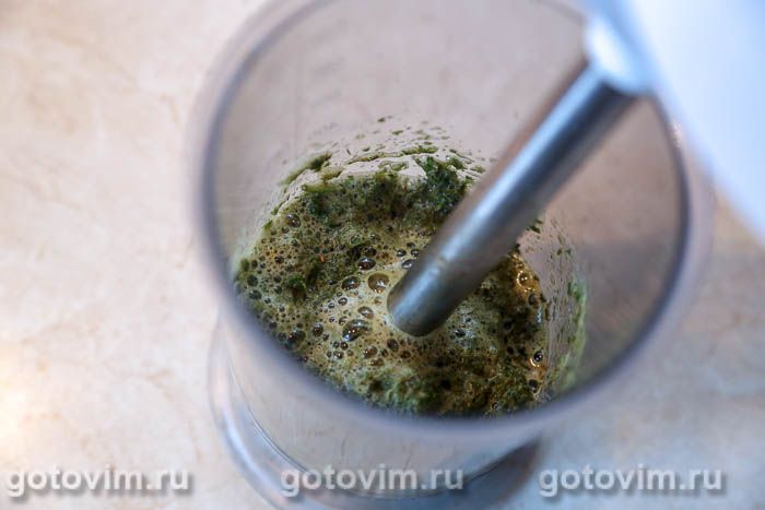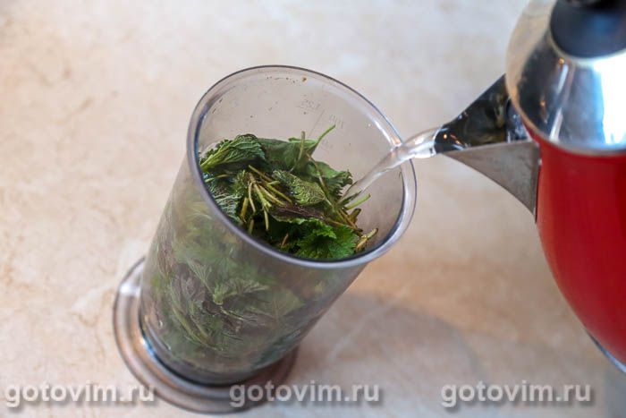 Измельчить большой пучок крапивы погружным блендером. Можно добавить немного воды, чтобы лучше измельчалась