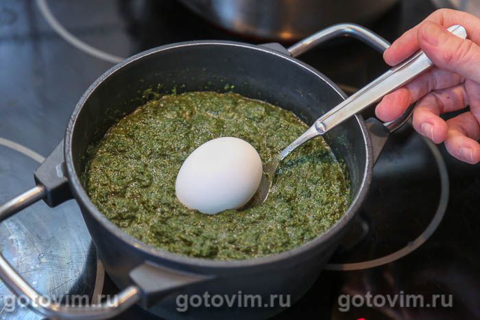 Перелить её в кастрюлю подходящего объема, чтобы яйца погрузились в кашицу полностью. Проварить кашицу минут 10