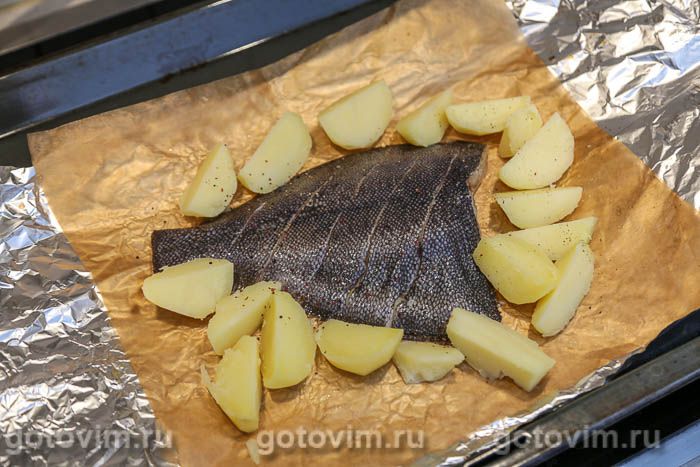 Рыбу с картошкой лучше запекать в фольге. И чтобы фольга не прилипла к камбале, используйте пекарскую бумагу. Бумагу смазать растительным маслом, уложить на неё камбалу и очищенный, недоваренный картофель, нарезанный четвертушками. Приподнять края фольги над рыбой с картошкой и отправить в разогретую до 190С духовку примерно на 20 минут.