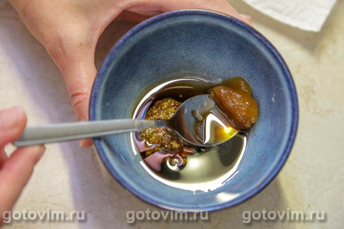 Для маринада к камбале смешать в небольшой миске зернистую горчицу с соевым соусом и растительным маслом, добавить мёд. Размешивать, пока мёд в маринаде не растворится.
