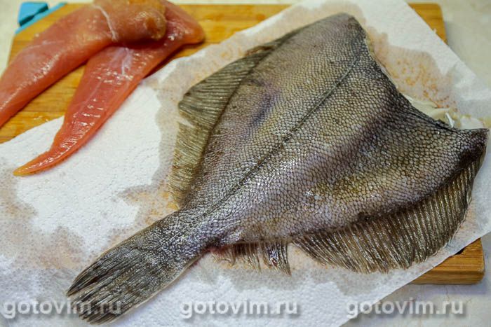 С потрошеных тушек камбалы счистить мелкую чешую, сполоснуть под проточной холодной водой, обсушить бумажными полотенцами снаружи и внутри.