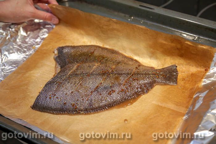 Противень застелить фольгой, затем положить лист пекарской бумаги и на него уложить камбалу. Приподнять края бумаги и фольги над рыбой, соединить и закрепить конвертом.