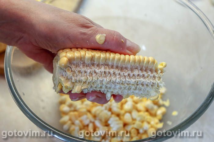 Очистить кукурузные початки. Отделить кукурузные зерна. В некоторых рецептах предлагают сразу натирать кукурузу на крупной терке, но тогда часть зерна останется на кочерыжке. Лучше отделить зерна вручную.