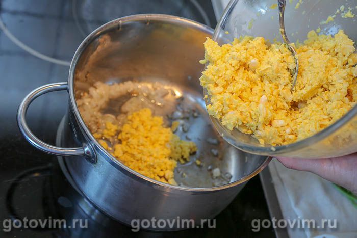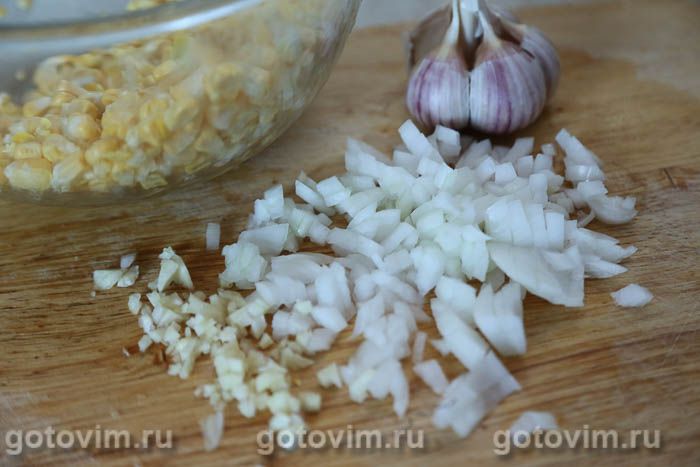 В кастрюле или сотейнике разогреть растительное масло. Добавить лук с чесноком и пассеровать, помешивая лопаткой, пока лук не станет прозрачным и мягким. Переложить к луку измельченную кукурузу, посолить, поперчить, хорошо перемешать и готовить на слабом огне, помешивая, 1-2 минуты.