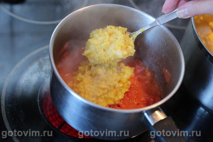 Переложить к томатам кукурузную кашу, размешать. Готовить 1-2 минуты под крышкой.