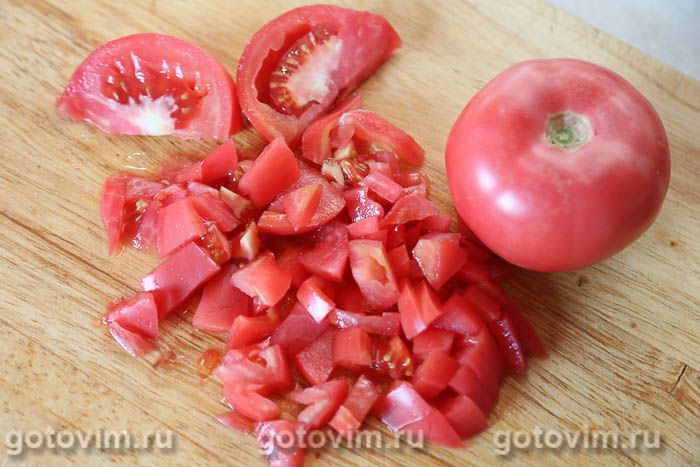 Пока варится кукурузная каша, помидоры нарезать кубиками.