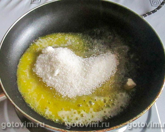 В сковороду положите сливочное масло, растопите его. Всыпьте сахар. Перемешайте.