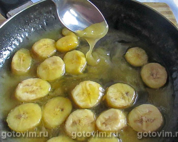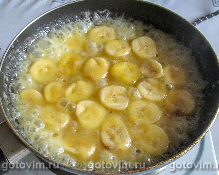 Положите в сковороду с карамелью бананы, нарезанные кружочками.