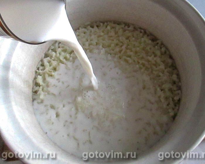 Налейте горячее молоко, перемешайте. Варите при средней мощности 20-25 минут.