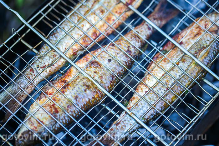 Кефаль подходит и для жарки, и для шашлыка. Рецепт кефали на решетке с пряными травами — классика для меню пикников. Рыба не требует каких0то замысловатых маринадов, быстро готовиться, и в ней мало костей. Готовую кефаль на гриле просто перекладывают на тарелку и легким движением отделяют филе от костей.