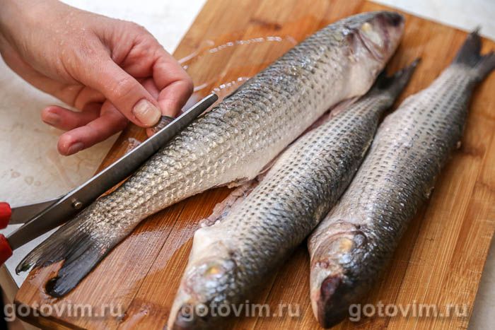 Кефаль почистить от чешуи и выпотрошить, стараясь не задеть желчный пузырь. Если он лопнет, рыба будет горчить! Рыбу промыть, тщательно удалив черную пленку от внутренностей в брюшке. Все плавники срезать (это удобно делать ножницами). В некоторых рецептах советуют вырезать жабры, но я их оставила.