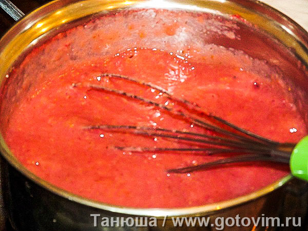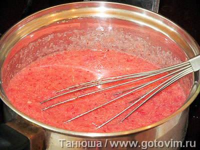 Добавить клубничное пюре, размешать и довести до кипения. Проварить, помешивая венчиком, 10 минут. Все готово