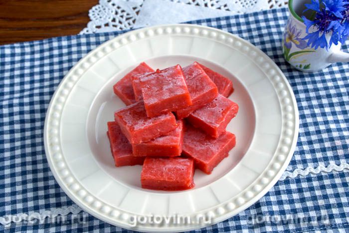 Нарезаем клубничную массу на небольшие квадратики. Клубничные желейные конфеты готовы.