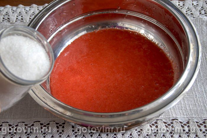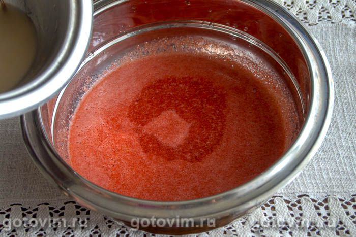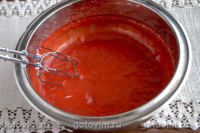 Измельчаем клубнику до состояния пюре. Отмеряем 180 мл ягодной массы и выкладываем ее в миску.