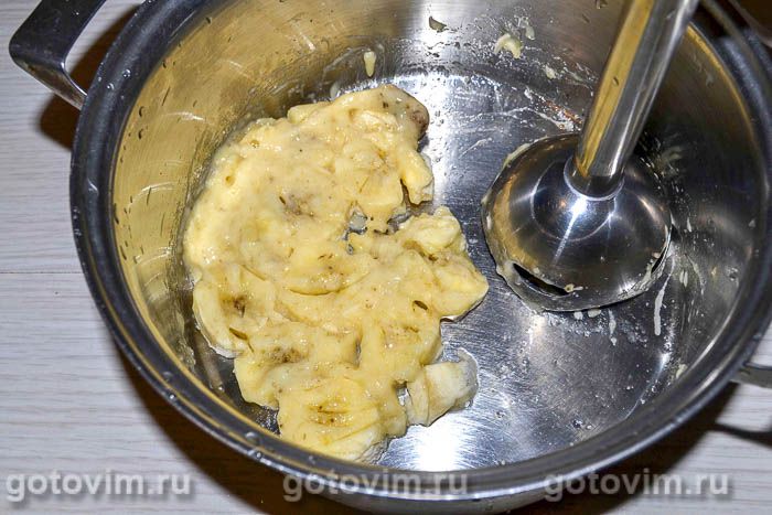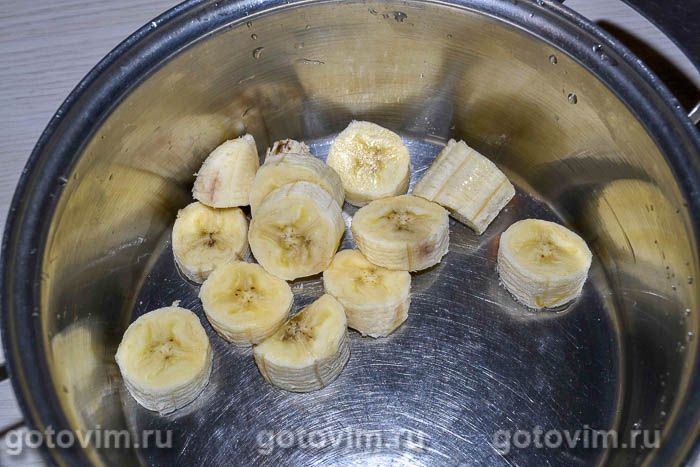 Очищенный банан нарежьте кружочками и сложите в небольшую кастрюльку.
