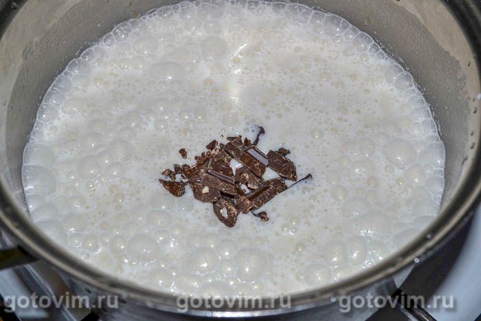 Поставьте кастрюльку на огонь и добавьте поломанный на кусочки шоколад.