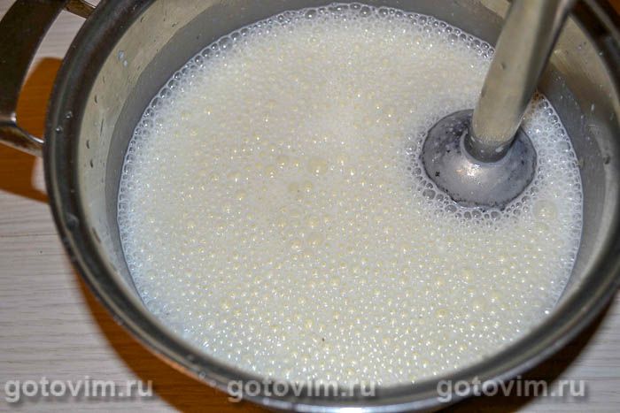 Доведите молоко до кипения и растворения шоколада. Еще раз взбейте массу погружным блендером./p>