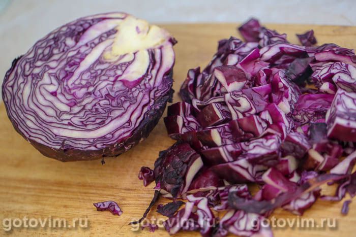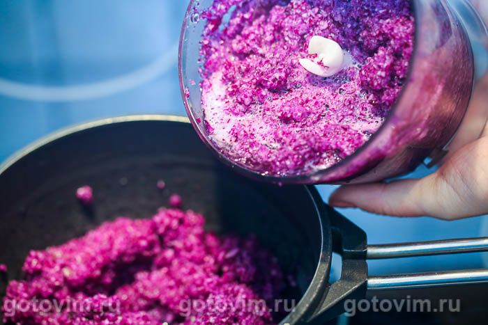 Краснокочанную капусту мелко порубить и сложить в чашу блендера.