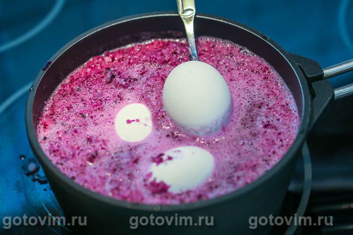 Измельчить капусту в крошку. Можно добавить немного воды, чтобы капуста лучше порубилась. Дальше можно пойти 2 путями. 1. Выдавить из капусты сок, добавить каплю столового уксуса и красить яйца соком. 2. Переложить капусту в ковш, добавить немного воды, чтобы получилась густая кашица, влить примерно 1/2 ч.л. столового уксуса и в эту кашицу положить яйца.