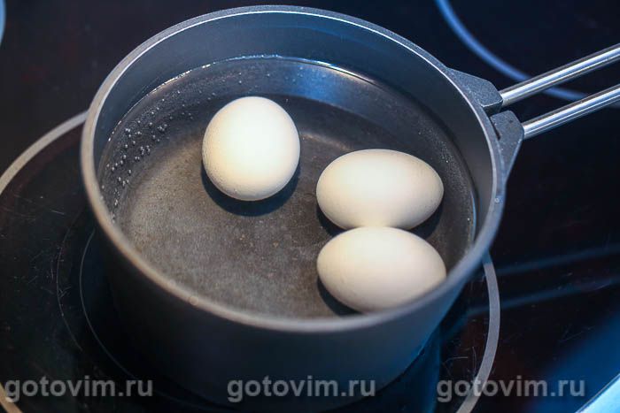 Куриные яйца вымыть, положить в холодную воду и варить 10 минут после закипания воды (или 11 минут, если яйца только что достали из холодильника). Сваренные вкрутую яйца переложить из кипятка на тарелку.