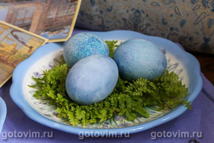 Я красила яйца вторым способом, поэтому на скорлупе появились неровности окраски от частичек рубленой капусты, и рисунок вышел «мраморный». Яйца стояли в этой кашице в холодильнике всю ночь. Окрашенные красной капустой яйца вынуть из кашицы, положить на тарелку, чтобы скорлупа высохла, а затем с помощью ватного диска смазать для блеска растительным маслом. Получились вот такие голубые яйца.