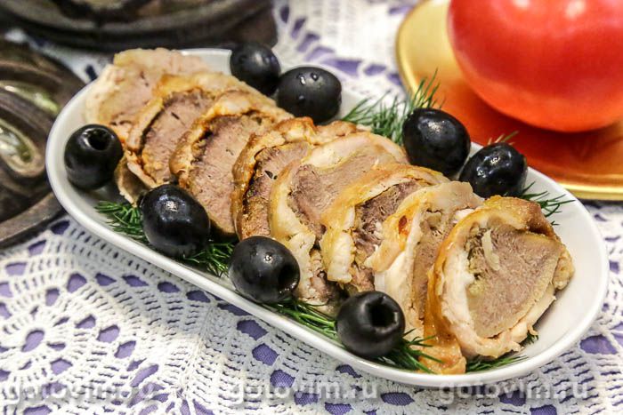 Уложить рулет на противень и поставить в заранее разогретую духовку до 180C примерно на 30-40 минут. Через 40 минут вынуть рулеты из духовки, разрезать фольгу, раскрыть и снова поставить в духовку. Продолжить запекать, поливая вытопившимся жиром, еще примерно 10 минут или до появления румяной корочки. Рулет из курицы со свиным языком готов. Переложить его на тарелку, дате немного остыть и можно нарезать ломтиками. Приятного аппетита!