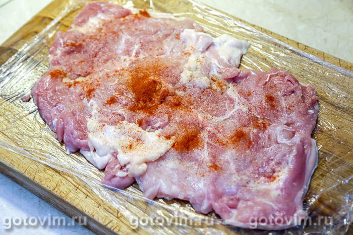 Уложить отбитое мясо с окорочков внахлест, чтобы получился прямоугольник, как на фото. Посыпать солью, молотым черным перцем и паприкой, втереть специи в мясо.