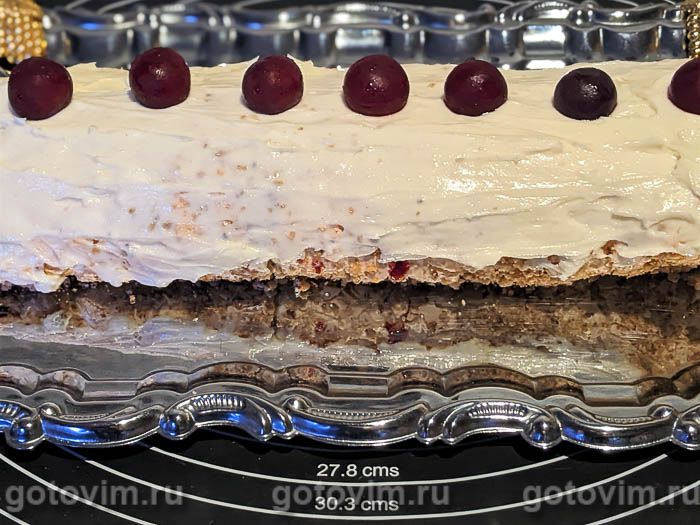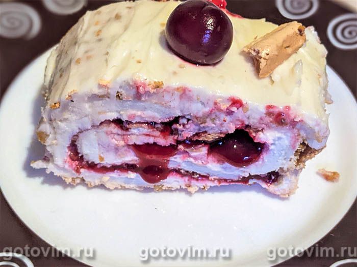 Если после выпечки сдобы или приготовления соуса у вас остались яичные белки, то стоит использовать их для меренгового рулета. Для начинки можно взять любой крем или повидло. В этом рецепте слой безе смазывают солоноватым сливочным сыром и прослаивают протертой с сахаром вишней, уваренной с крахмалом до густоты. Сочетание солоноватого сливочного сыра, кислой вишни и сладкой меренги просто божественно.