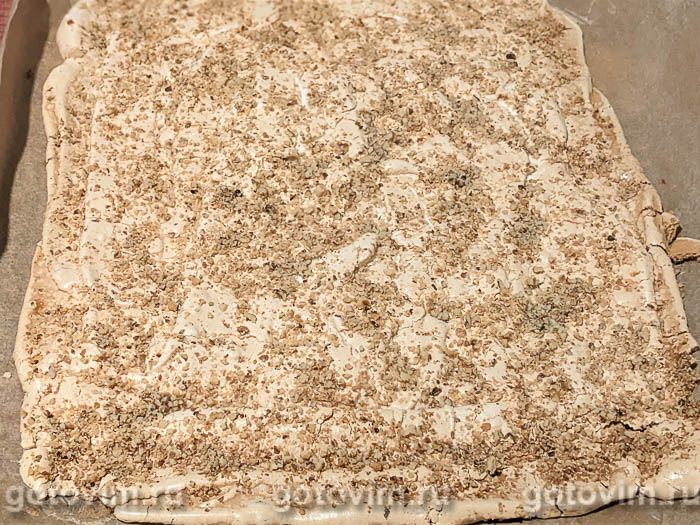 Застилаем противень бумагой для выпечки, выкладываем устойчивую белковую массу. Сверху посыпаем ореховой крошкой, выпекаем 45 минут при 150С.