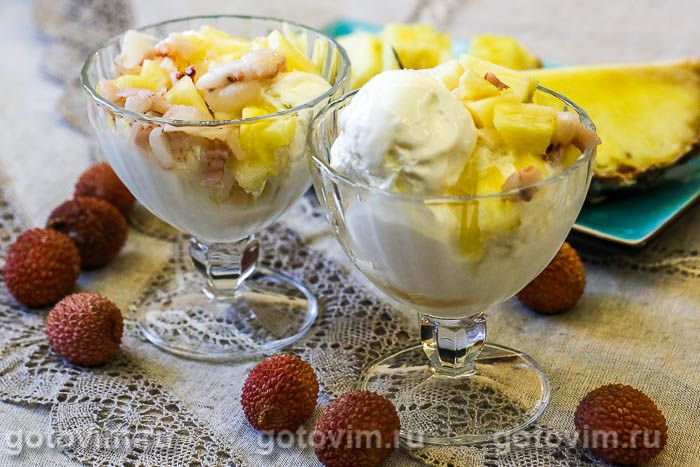 Рецепт быстрого десерта из готового мороженого с кусочками свежего ананаса и личи. Конечно, можно сделать домашнее мороженое и заменить свежие фрукты консервированными, но тогда для приготовления десерта потребуется больше времени.