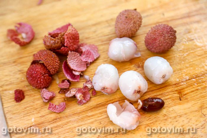 Личи очистить, удалить косточку. Мякоть порезать на четвертинки.