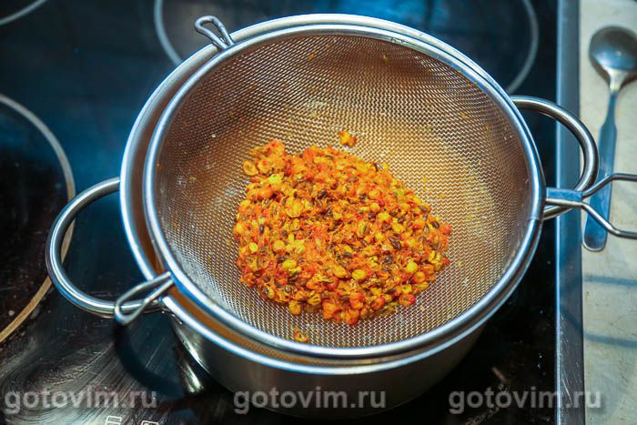 Ягоды немного помять толкушкой, переложить на дуршлаг, снова хорошенько помять ложкой и отцедить сок. Собранный сок убрать в холодильник.