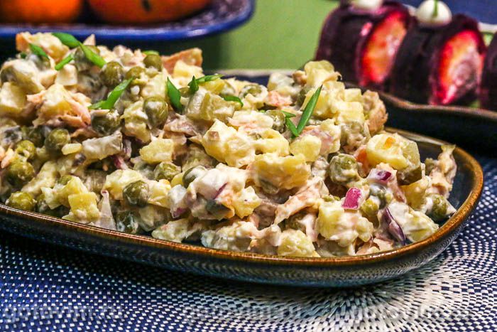 Да, для «Оливье» используют мясо, но мы уже столько раз меняли рецептуру салата, что добавление копченой рыбы не должно стать для вас неожиданность. Попробуйте этот вариант с горбушей горячего копчения. Получается вкусно, необычно и похоже на салат оливье, хотя и без мяса. Вместо горбуши можно взять другую красную или белую копченую рыбу.