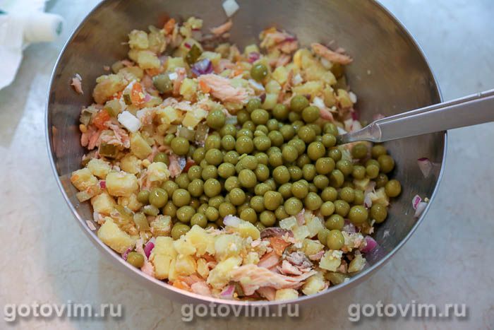 Добавить в салатник рыбу, зеленый горошек, посолить, поперчить по вкусу и перемешать.