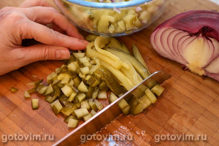Соленые или маринованные огурцы (кому какие больше нравятся) нарезать мелкими кубиками. То же проделать с луком. У меня был сладкий красный лук, с ним вкуснее. Если не планируете сразу подавать оливье на стол, нарезку из лука и огурцов можно хранить отдельно от остальных ингредиентов салата, и добавлять их в последний момент, перед самой подачей.