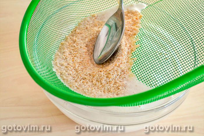 Хлопья пересыпаем в глубокую чашу и заливаем их кипяченой водой комнатной температуры. Оставляем настаиваться 10-12 часов при комнатной температуре. Очень удобно заливать хлопья с вечера, чтобы к утру они хорошенько разбухли.